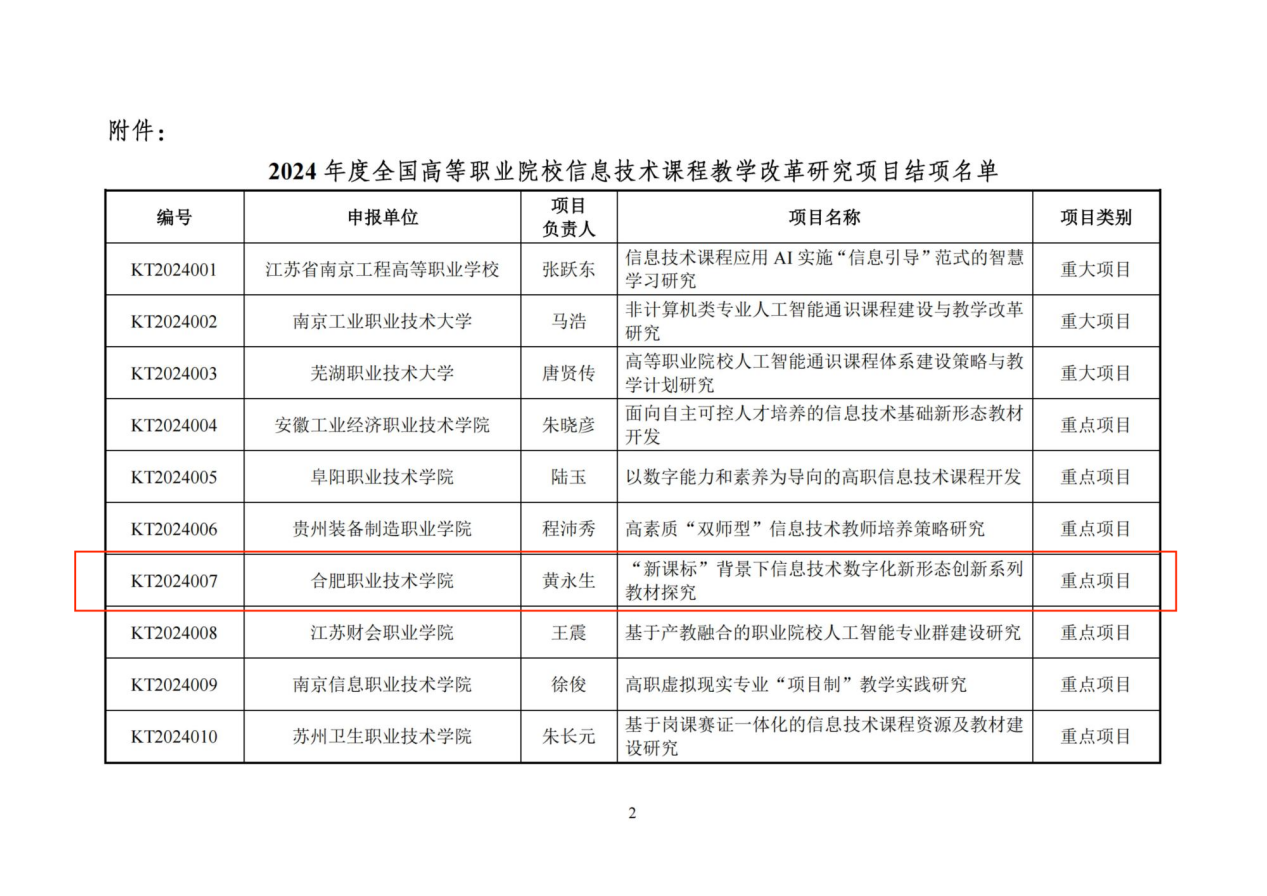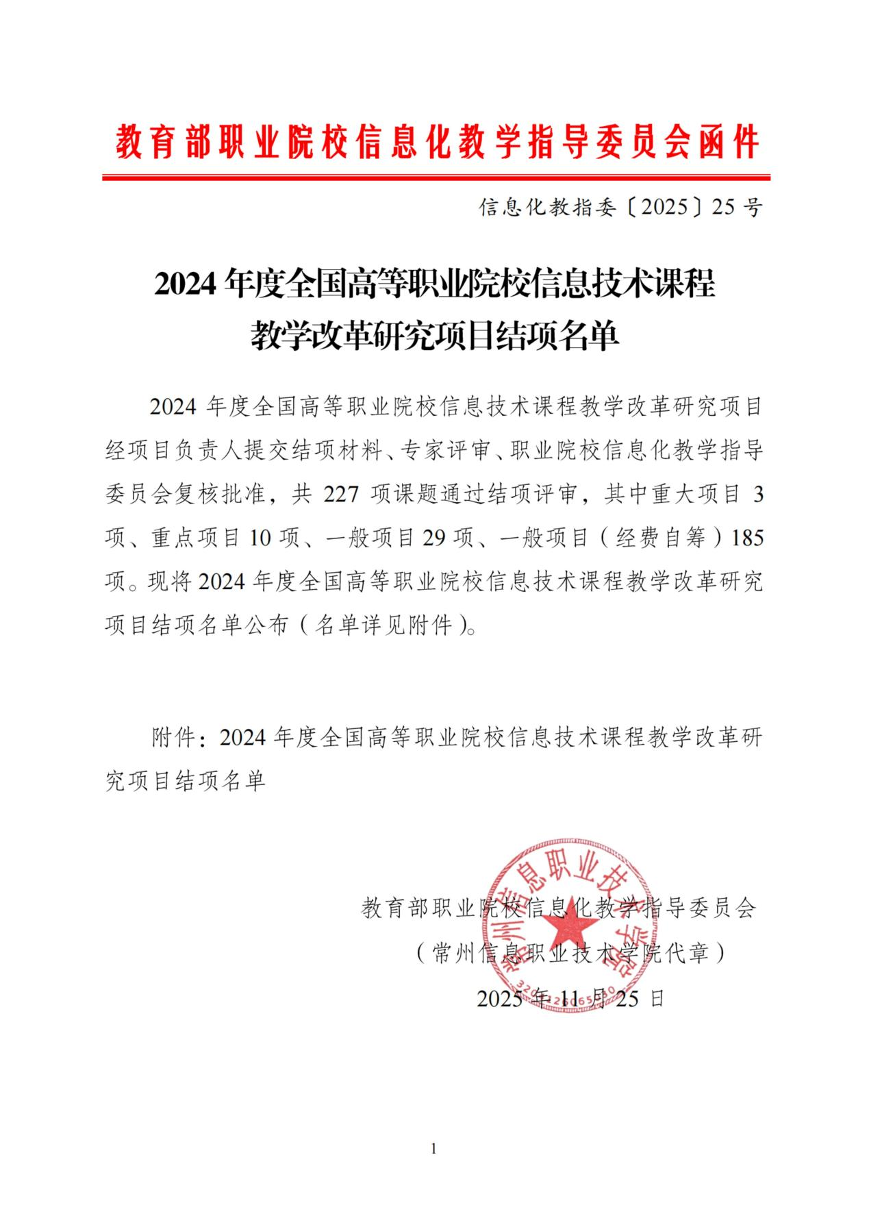 近日,教育部职业院校信息化教学指导委员会公布了2024年度全国高等职业院校信息技术课程教学改革研究项目结项名单。我校申报的重点项目《“新课标”背景下信息技术数字化新形态创新系列教材探究》(项目编号:KT2024007)顺利通过结项评审。